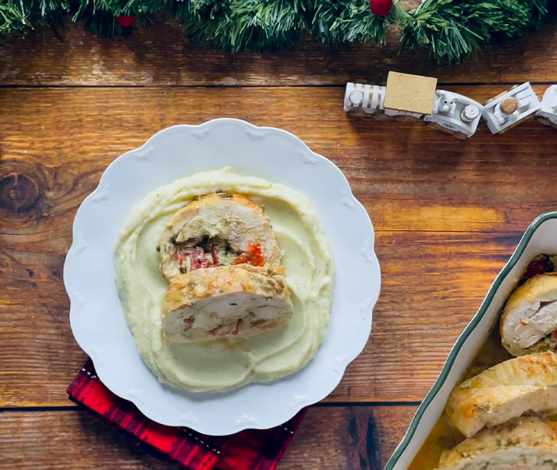Σε ένα μπολάκι βάζουμε τα ντοματίνια, το πέστο, την ρικότα, το αλατοπίπερο και ετοιμάζουμε την γέμιση. Σε ένα ταψί απλώνουμε το στήθος γαλοπούλας και βάζουμε μέσα τη γέμιση. Τυλίγουμε σε ρολό και δένουμε με σπάγκο. Ρίχνουμε από πάνω τον ζωμό που έχουμε ετοιμάσει ανακατεύοντας τον χυμό λεμονιού, πορτοκαλιού, το λάδι, τα μπαχαρικά, τη μουστάρδα και το νερό για να ψηθεί η γαλοπούλα. Ψήνουμε σκεπασμένη για 45 λεπτά στους 180 βαθμούς σε προθερμασμένο φούρνο και μετά ξεσκέπαστη για άλλα 20-30 λεπτά. Αφού κρυώσει ελαφρώς κόβουμε σε φέτες και σερβίρουμε με τον αρωματικό πουρέ που έχουμε ετοιμάσει ρίχνοντας στο καυτό γάλα και νερό την σκόνη πουρέ. Στο τέλος βάζουμε το βούτυρο, το πέστο κι το αλατοπίπερο.